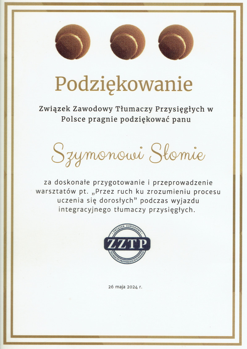 "[...] za doskonałe przygotowanie i przeprowadzenie warsztatów pt. "Przez ruch ku zrozumieniu procesu uczenia się dorosłych" podczas wyjazdu integracyjnego tłumaczy przysięgłych."
