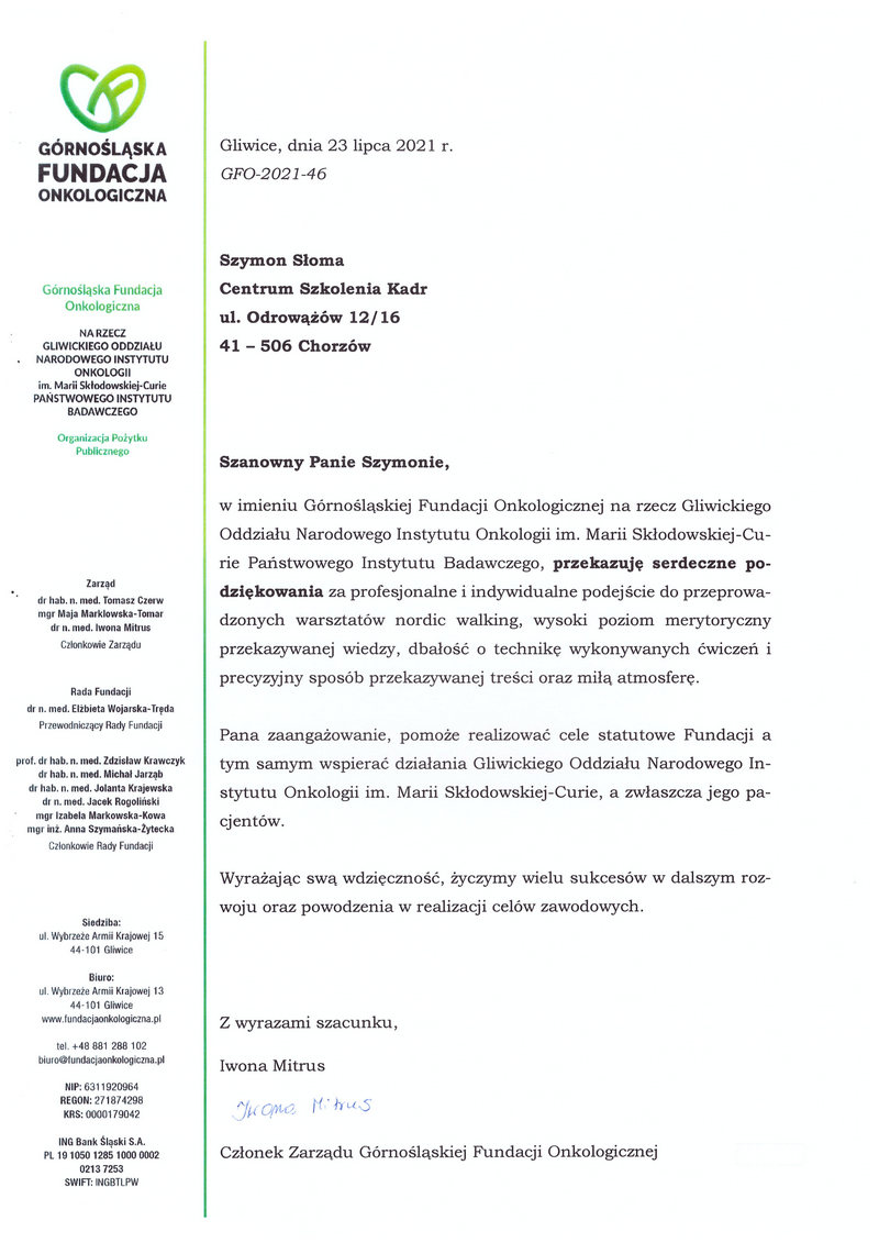 "Szanowny Panie Szymonie, w imieniu Górnoślqskiej Fundacji Onkologicznej na rzecz Gliwickiego Oddziału Narodowego Instytutu Onkologii im. Marii Sklodowskiej-Curie Państwowego Instytutu Badawczego, przekazuję serdeczne po dziękowania za profesjonalne i indywidualne podejście do przeprowadzonych warsztatów nordic walking, wysoki poziom merytoryczny przekazywanej wiedzy, dbałość o technikę wykonywanych ćwiczeń i precyzyjny sposób przekazywanej treści oraz miłą atmosferę.