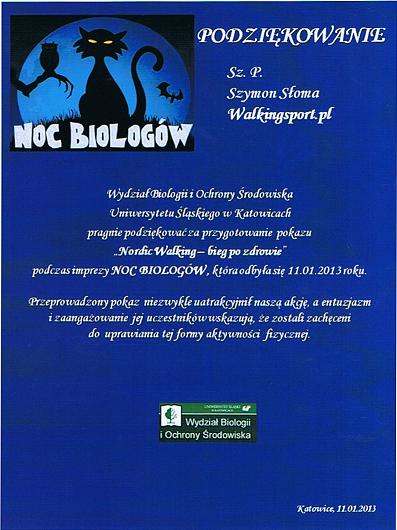"Wydział Biologii i Ochrony Środowiska Uniwersytetu Śląskiego w Katowicach pragnie podziękować za przygotowanie pokazu "Nordic Walking- bieg po zdrowie" podczas imprezy Noc Biologów, która odbyła się 11.01.2013 roku.