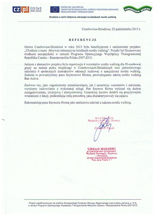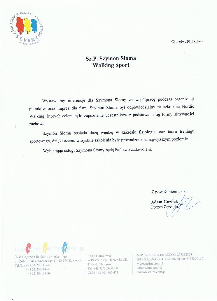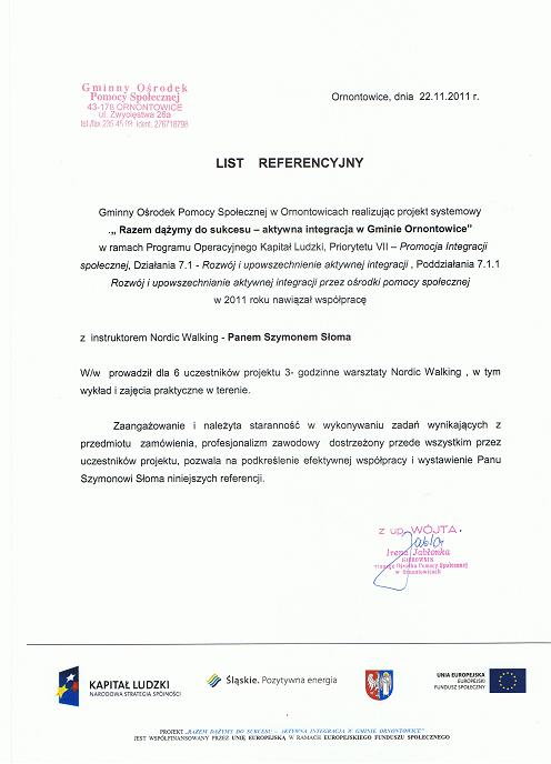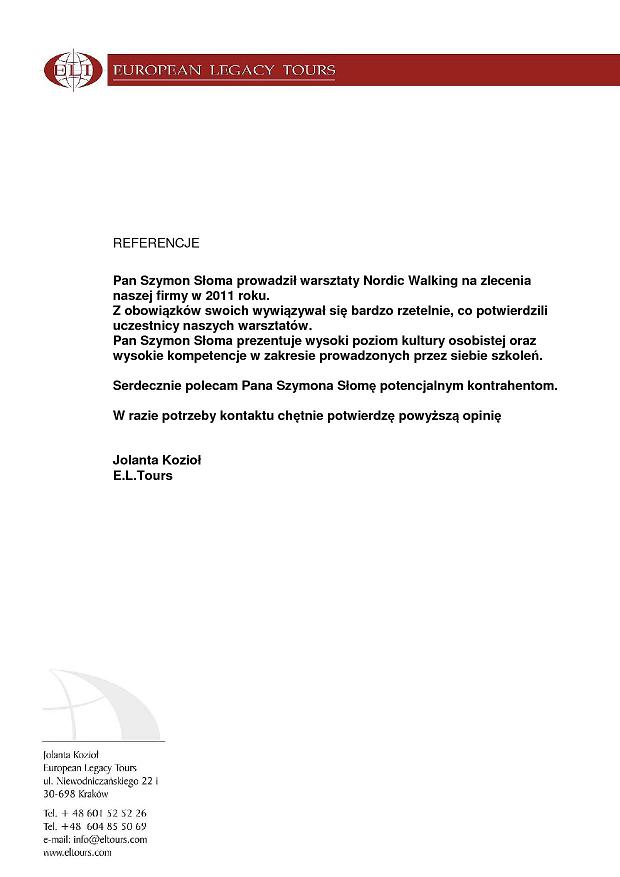 "Pan Szymon Słoma prowadził warsztaty Nordic Walking na zlecenia naszej firmy w 2011 roku. Z obowiązków swoich wywiązywał się bardzo rzetelnie, co potwierdzili uczestnicy naszych warsztatów. Pan Szymon Słoma prezentuje wysoki poziom kultury osobistej oraz wysokie kompetencje w zakresie prowadzonych przez siebie szkoleń.
