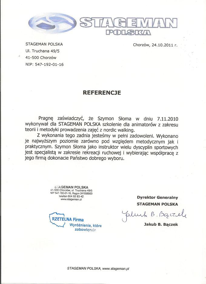 "Pragnę zaświadczyć, że Szymon Słoma w dniu 7.11.2010 wykonywał dla STAGEMAN POLSKA szkolenie dla animatorów z zakresu teorii i metodyki prowadzenia zajęć z nordic walking.